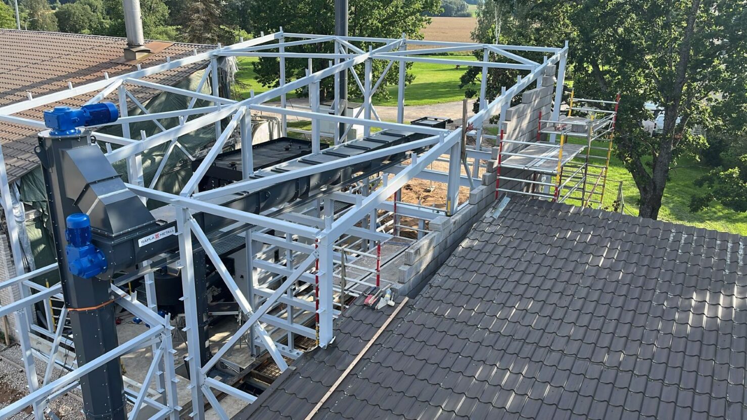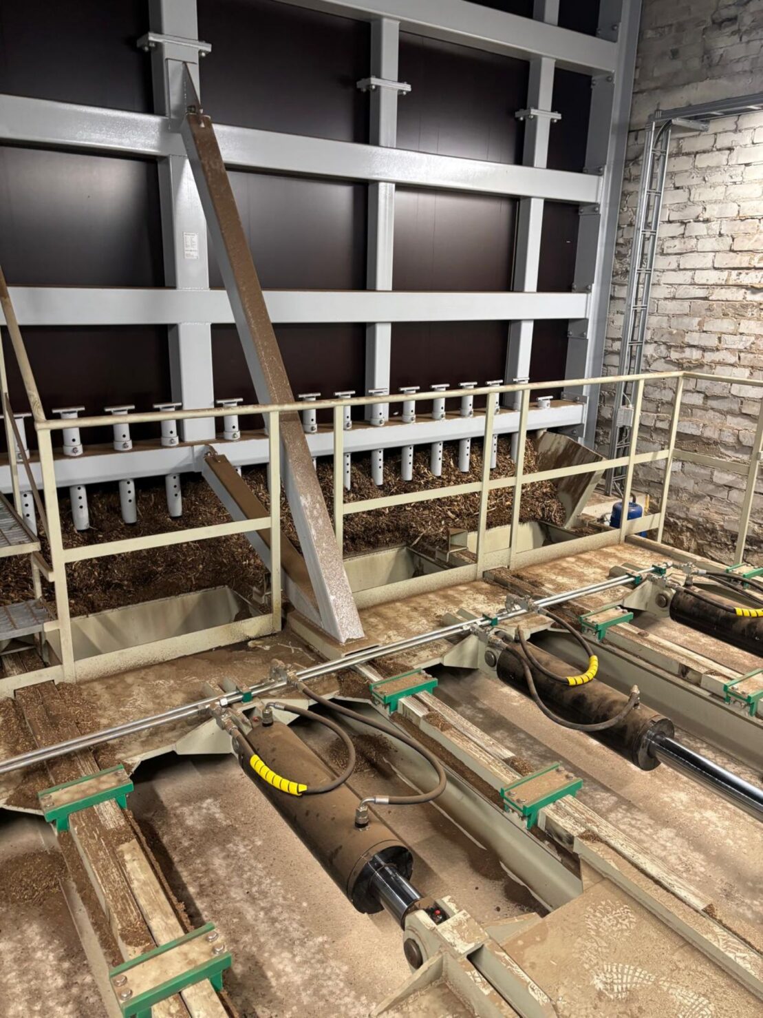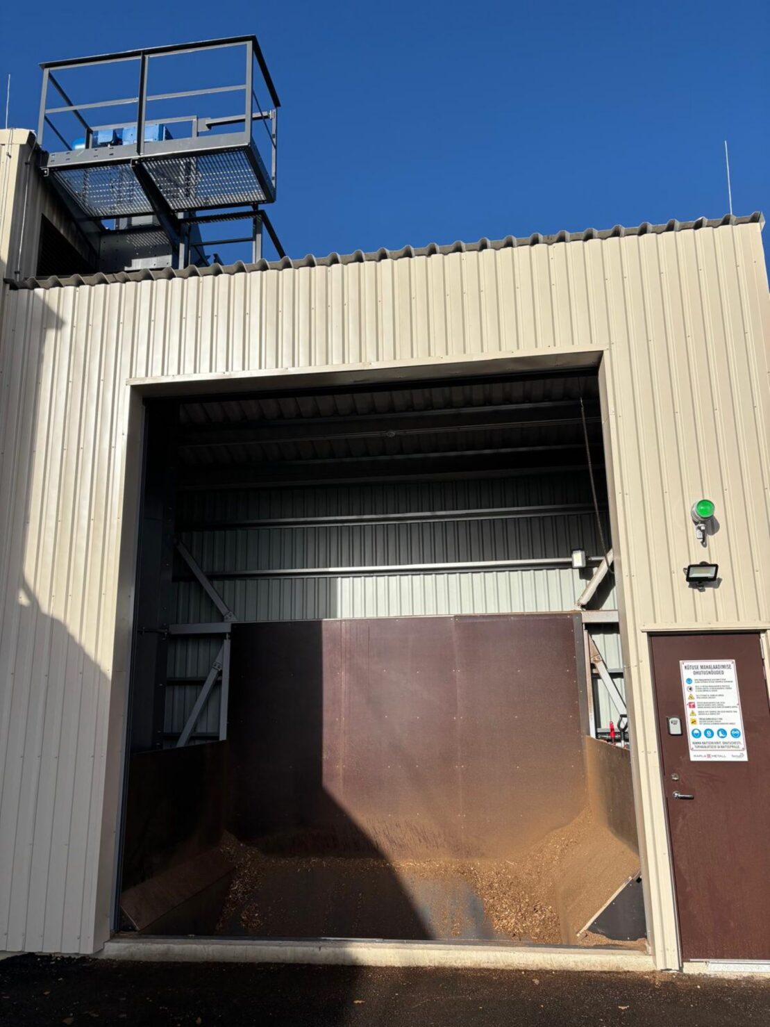 The boiler house is equipped with a Tamult biomass furnace and boiler with a nominal thermal output of 0.85 MW (at 55% fuel moisture content), operating automatically within a 30–100% load range. Fuel is received directly from trucks without the need for additional handling equipment, and the 210 m³ fuel storage is fitted with a hydraulically driven scraper floor system, ensuring consistent and reliable fuel feeding.